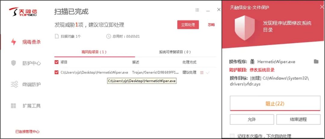 Õë¶ÔHermeticWiper¶ñÒâÈí¼þ£¬£¬£¬µ±¸Ã¶ñÒâÈí¼þδ±»´¥·¢£¬£¬£¬×¯ÏÐÓÎÏ·EDRͨ¹ý²¡¶¾É¨Ãè¼´¿É¶ÔÆä¾ÙÐо«×¼Ê¶±ðÓë´¦Öóͷ££»£»µ±¸Ã¶ñÒâÈí¼þ±»´¥·¢£¬£¬£¬Ôò»á¶ÔϵͳĿ¼¾ÙÐиĶ¯ÆÆËð´ÅÅÌ£¬£¬£¬×¯ÏÐÓÎÏ·EDR¿Í»§¶Ëϵͳ¼Ó¹ÌÊÖÒտɶÔϵͳҪº¦Î»ÖþÙÐÐÖØµã¼à¿Ø£¬£¬£¬±ÜÃâ±»¶ñÒâ¸Ä¶¯£¬£¬£¬É¨³ý»òÆÆËðϵͳÊý¾Ý¡£¡£¡£¡£¡£Í¬Ê±£¬£¬£¬Èô¸Ã¶ñÒâÈí¼þͨ¹ýUÅÌ¡¢Óʼþ¡¢ÍøÒ³¡¢Í¨Ñ¶¹¤¾ßµÈ·½·¨Èö²¥£¬£¬£¬×¯ÏÐÓÎÏ·EDRÔò¿ÉÒÔͨ¹ýUÅ̱£»£»¤¡¢Óʼþ±£»£»¤¡¢¶ñÒâÍøÕ¾×èµ²¡¢ÎļþʵÑé¼à¿ØµÈ¶àά¶È²¡¶¾·ÀÓù£¬£¬£¬ÖÜÈ«¶Å¾ø¶ñÒâÈí¼þÂ䵨ÖÕ¶Ë¡£¡£¡£¡£¡£