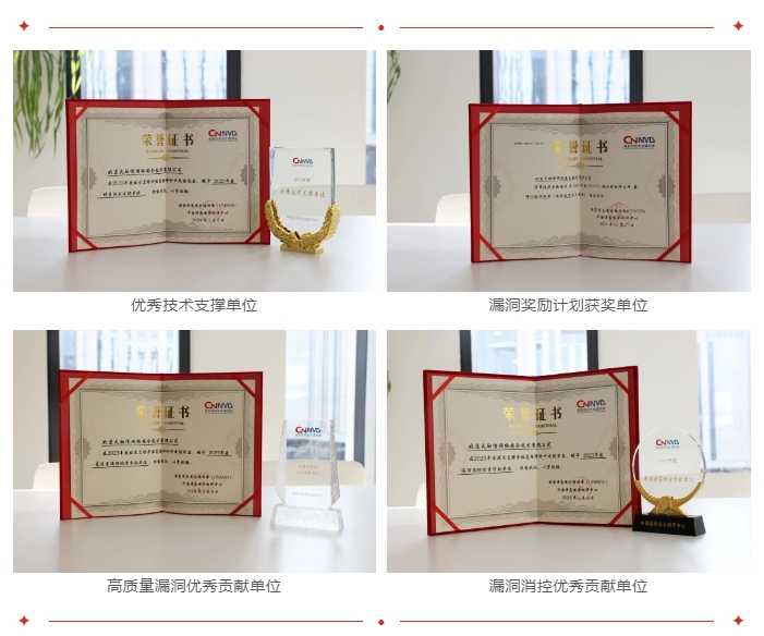 阻止现在,,,庄闲游戏已一连11年获得国家信息清静误差库(CNNVD)手艺支持单位(一级),,,一连8年连任国家信息清静误差共享平台(CNVD)手艺组支持单位称呼,,,4次获得国家工业信息清静误差CICSVD“手艺组成员单位”称呼,,,首批获得信创政务产品清静误差专业库(CITIVD)手艺支持单位。。
